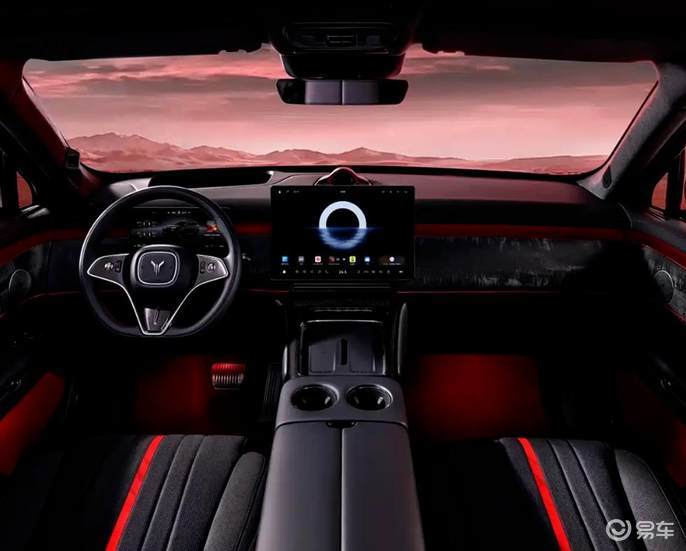 内饰中黑武士版本采用黑红配色,部分装饰面板采用碳纤维材质,中控台饰板采用流云墨韵装饰凸显个性化。内饰车顶除了21.4英寸吸顶屏外,黑武士还带来了598颗LED灯珠的星河天幕星空顶。